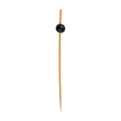 Bambus-Cocktailspieße mit natürlichem Aussehen und modernem Dreh. Diese Spieße lassen sich leicht durch die schwarze Kugel am oberen Ende greifen. Verwenden Sie die Spieße auch für Hamburger, Wraps, Spieße und Cocktails.